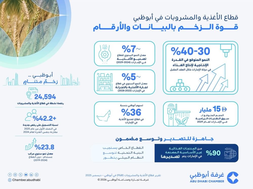 This report represents the first sector-specific publication under the chamber’s 2025-2028 strategy. It highlights continuous expansion in production capacity, rising export potential, and the evolution of the innovation ecosystem that strengthens Abu Dhabi’s position as one of the region’s most competitive and resilient food economies.