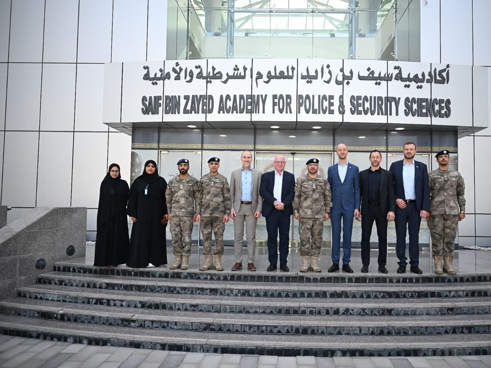 Brigadier Dr. Rashid Mohammed Borshid, Director of the Saif Bin Zayed Academy for Police and Security Sciences, received the delegation and briefed them on the training and qualification system in place. During the meeting, both parties discussed ways to coordinate and cooperate in policing and security work, exchange scientific and specialized knowledge, and conduct benchmark comparisons of best practices and developmental services.